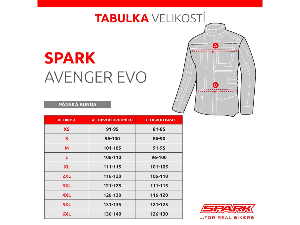 Inovovaná, dlouhá, třívrstvá, textilní moto bunda určena pro nejnáročnější motorkáře. Moto bunda Spark AVENGER EVO je vybavena velkým množstvím ventilačních otvorů. Každá ventilace má vstup i výstup pro kvalitní proudění vzduchu (celé rukávy, klíční kosti, celá záda odnímatelná, odnímatelné hrudní panely), stahovacích pásků, které zajišťují maximální pohodlní při jízdě, voděodolnými zipy, odnímatelnou masku obličeje a spoustu kapes (vodotěsná kapsa na mobilní telefon). Navíc oceníte tepelnou vložku, kterou použijete i jako plnohodnotnou samostatná bundu s postranními kapsami a jednou náprsní kapsou.